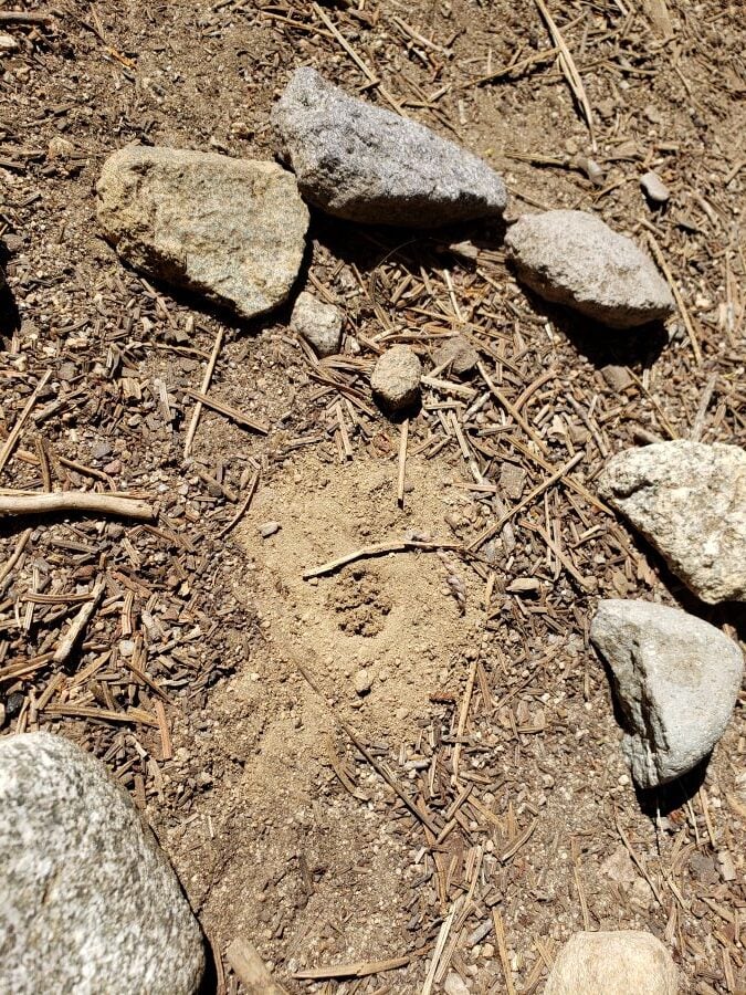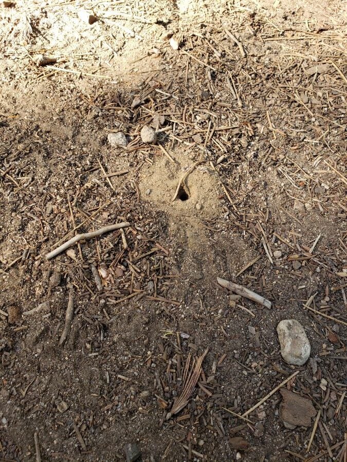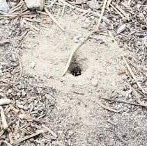 About 70% of native California bees are ground nesters. The female bees dig holes and tunnels in the ground and prepare an elaborate nest for their eggs, complete with waterproofing. She provisions it with loaves of a pollen and nectar mixture and leaves one loaf for each egg she lays. She seals off each egg compartment as she goes so each egg has what it needs to grow into an adult and emerge in spring. (Note: these are not yellow jackets!)